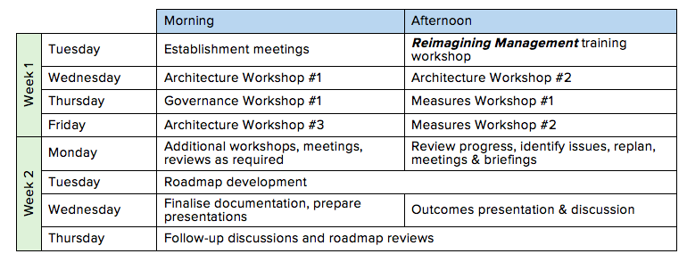 A timetable template is presented in the table below. This plan is designed to optimise project time and make the maximum progress towards establishing process-based management. Eight days over two contiguous weeks are assumed for this highly-focused plan.